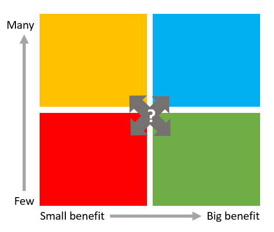 Down in the bottom-right, green area there may be very few customers (users, readers) or very few occasions relevant to a specific knowledge artefact. But if it’s the right artefact, the benefit when it’s needed could be very big.