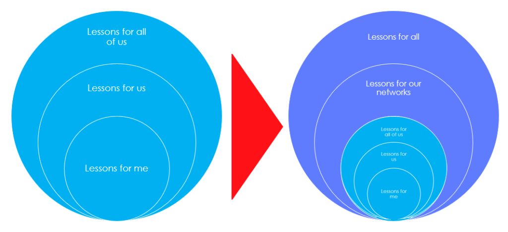 But it was clear right at the start that ‘lessons for all of us’ is a complicated scope with different sub-levels. It’s really a whole second tier, rather than just a third level, and ‘lessons for us’ at the organisational level is really only a lower rung on that second tier.